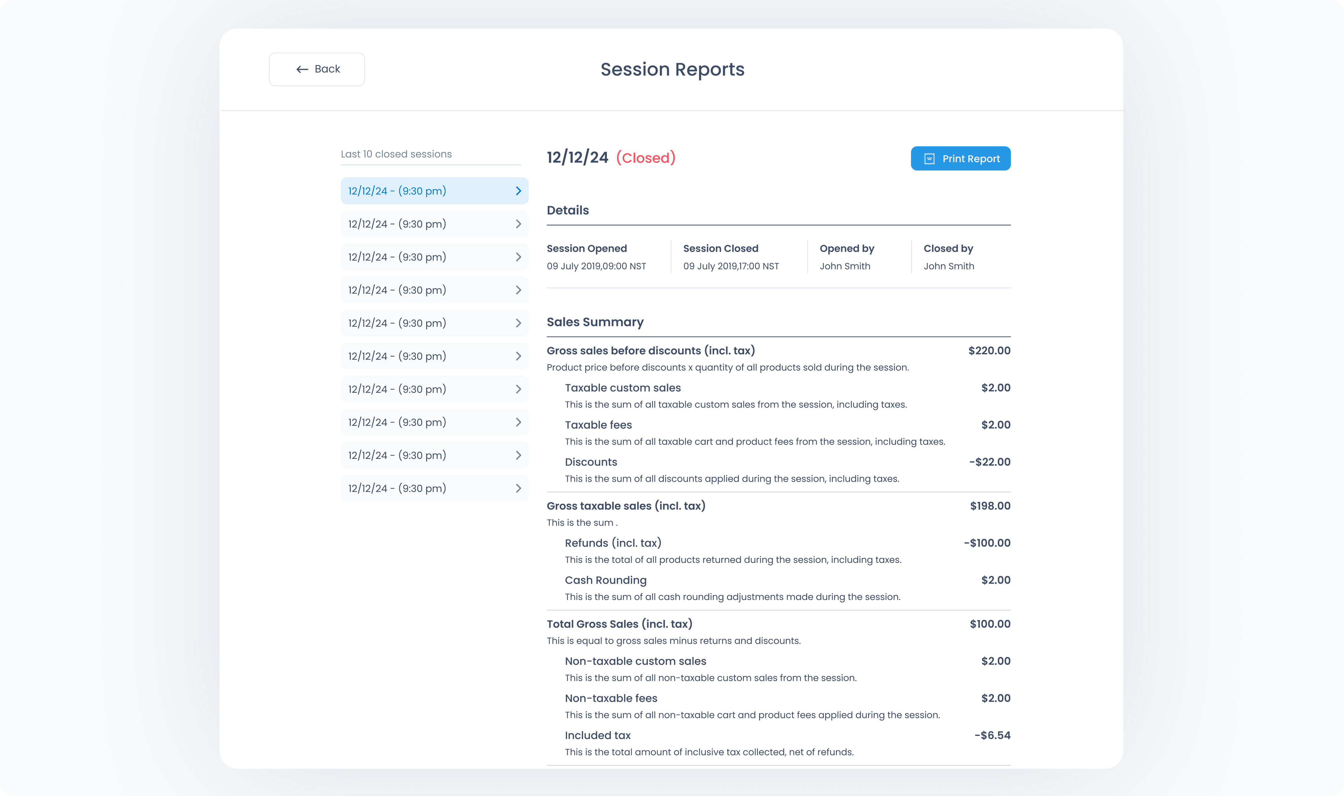 The second item in the Station Home sidebar is session reports. This tab displays reports for the last ten sessions on the current station. For each session, you can view opening and closing details along with a sales summary, including: gross sales, discounts, gross taxable sales, refunds, net sales, tax collected, tax refunded, cash rounding, and total sales after taxes. Moreover, under Cash Drawer, you can see the opening and closing cash amounts entered by the user, the total cash payments and refunds during the session, and the difference between the expected and counted drawer amount at closing