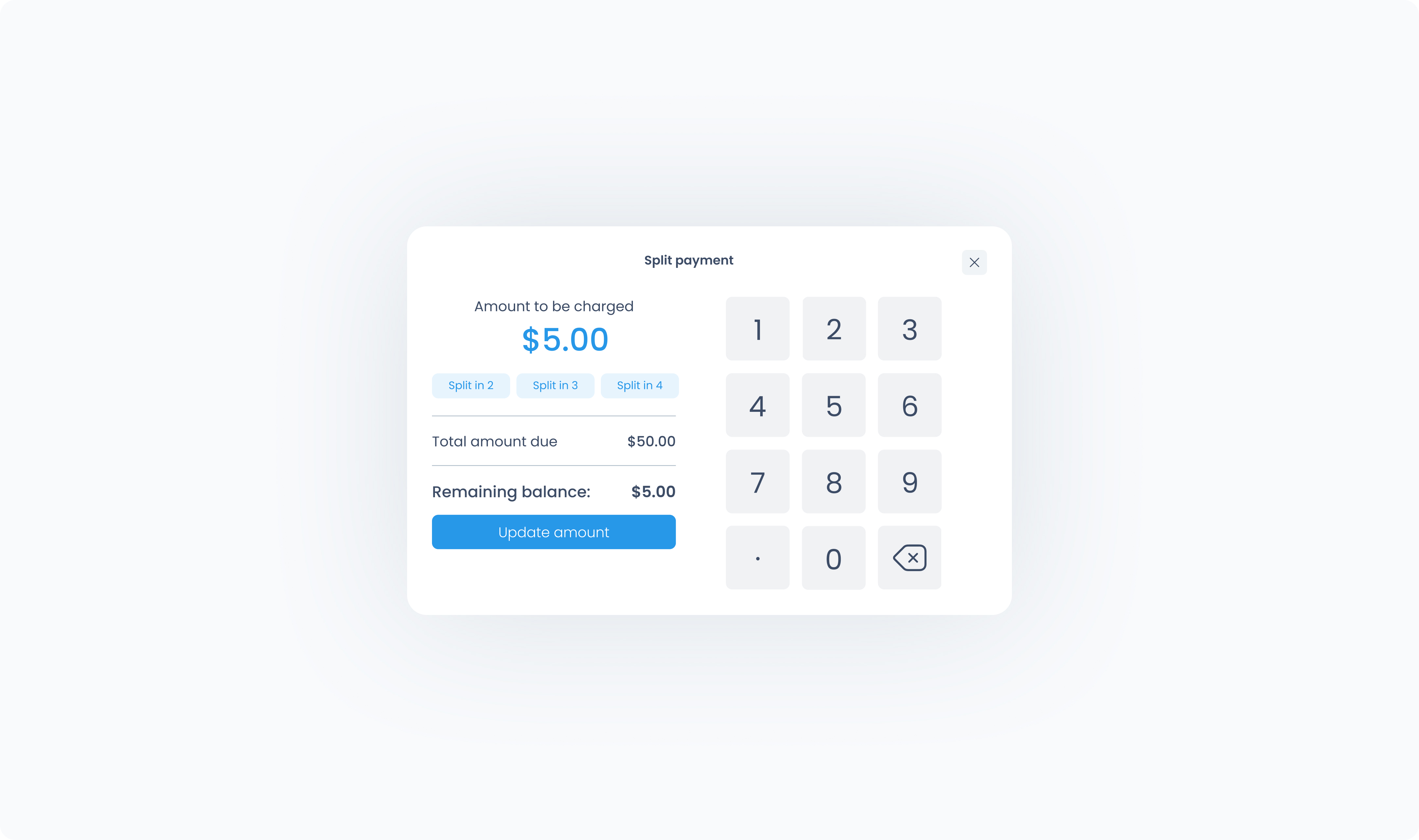 Once the payment goes through, the remaining balance is reduced. If there’s still an amount left to pay, the user can either select a method to cover the rest or trigger another Partial payment dialog box to continue splitting the total.
