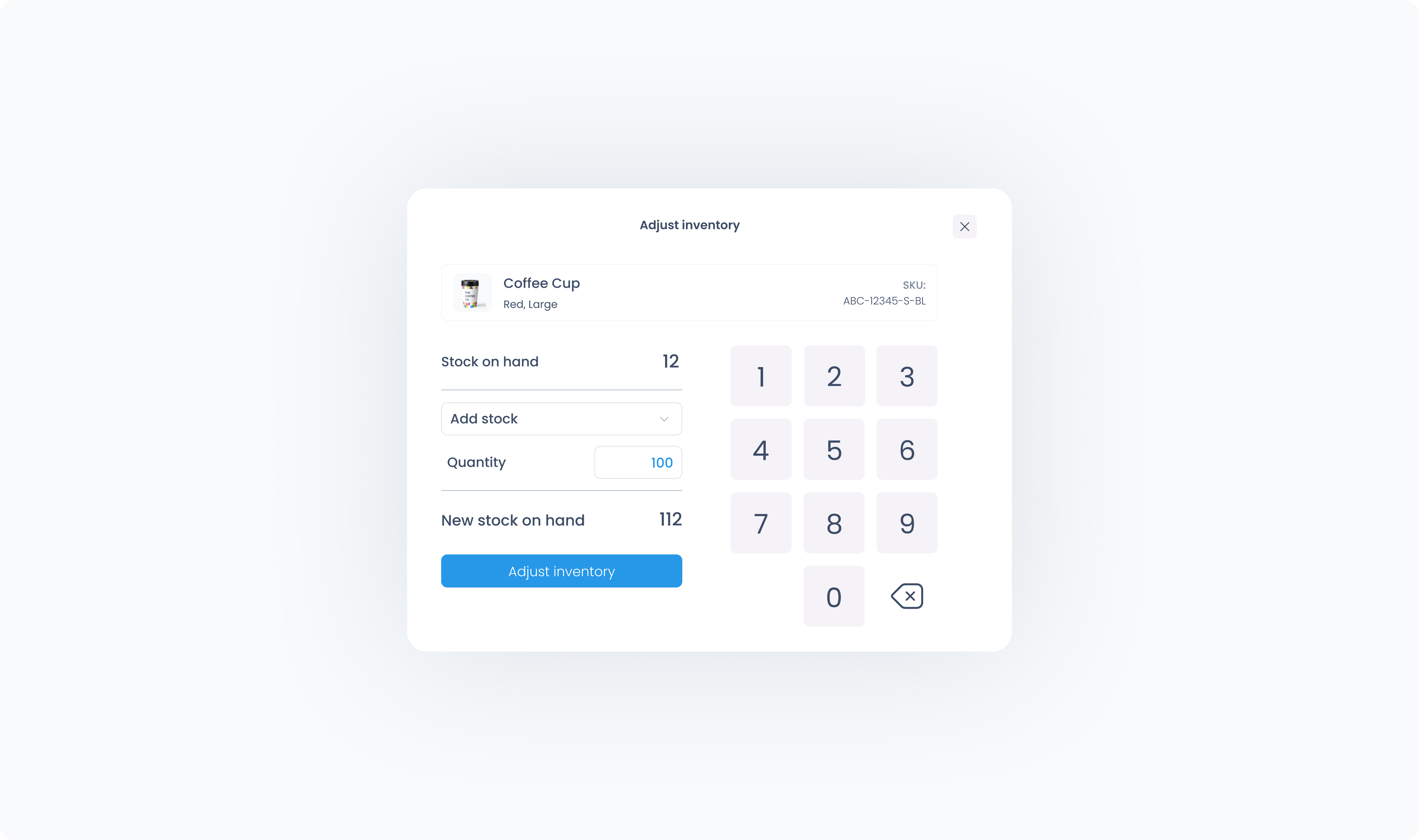 This dialog box appears when an Adjust inventory action is triggered with the setting "Open adjust inventory" enabled in Builder.