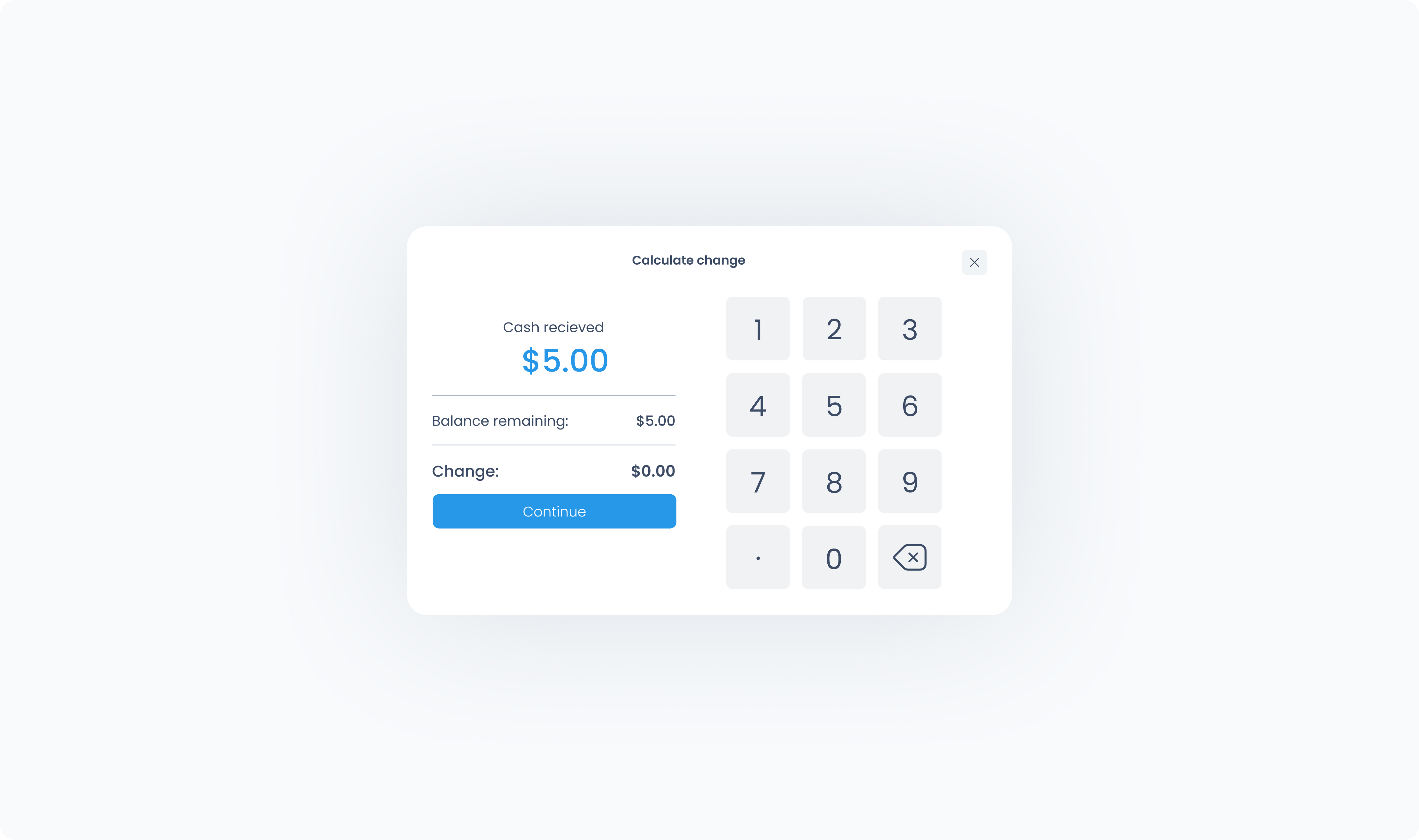 The change calculator dialog box appears when the Cash payment action is triggered and configured to show the change calculator. It is used to enter the amount of cash received from the customer and calculate the correct change to return.