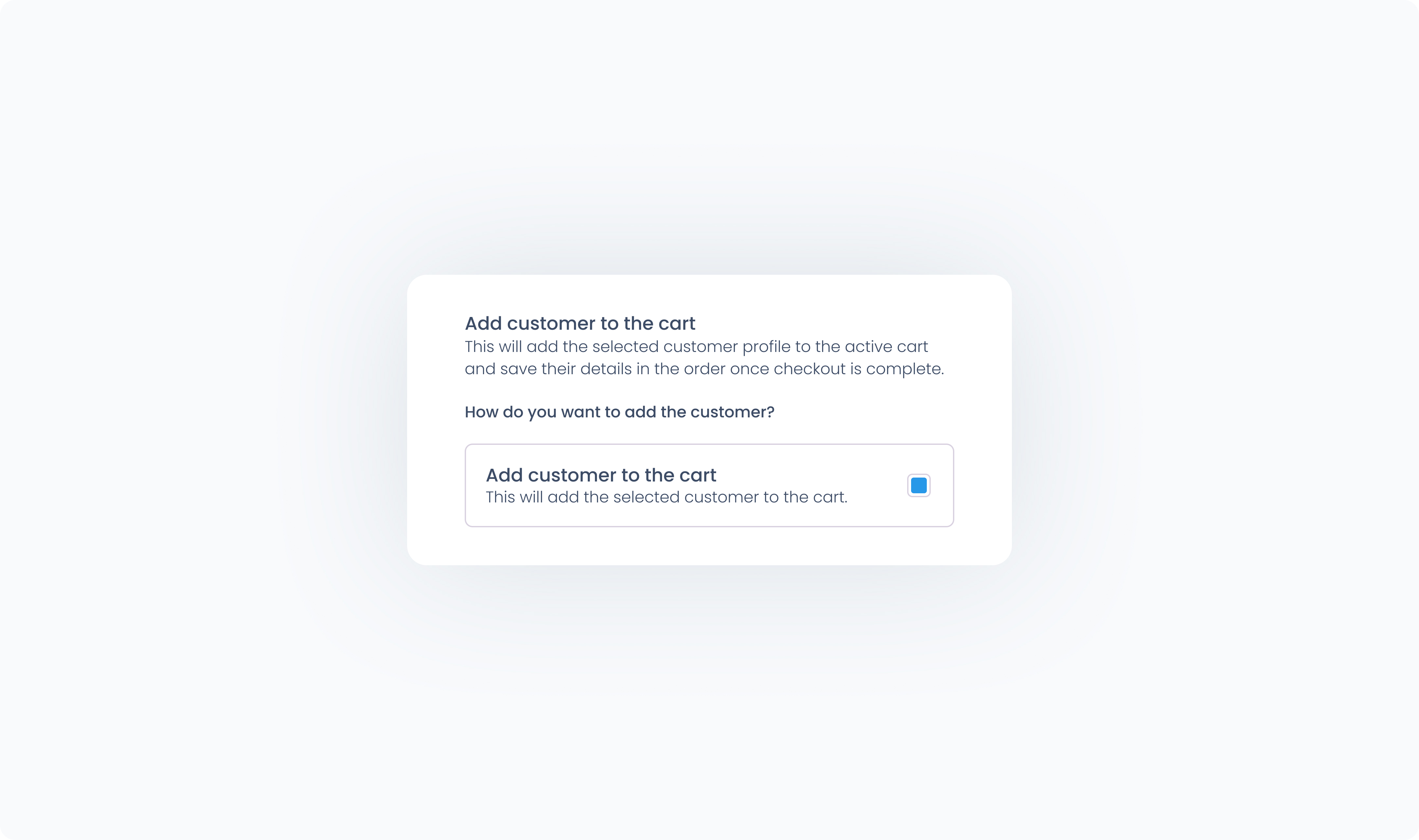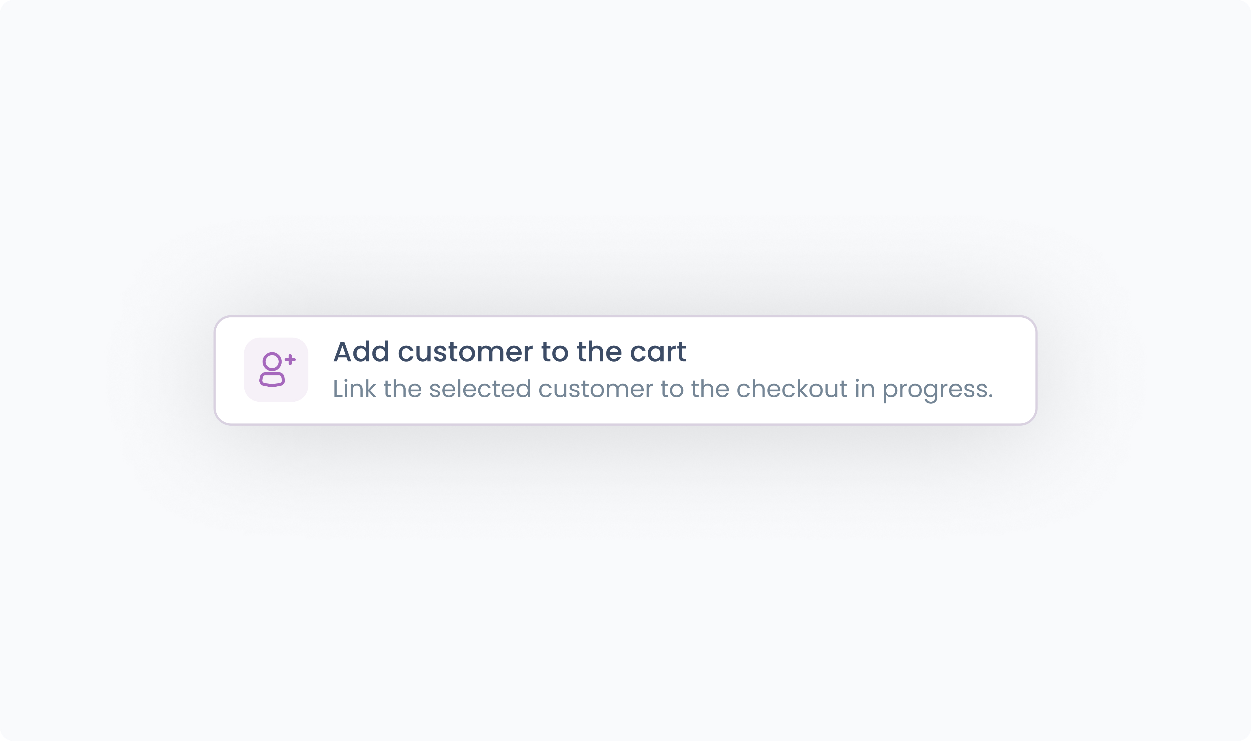 This action adds the currently selected customer, typically chosen from a customer list or grid, to the active cart in the checkout flow. There are no additional configuration options required. Once triggered, the action will automatically associate the selected customer with the active order.