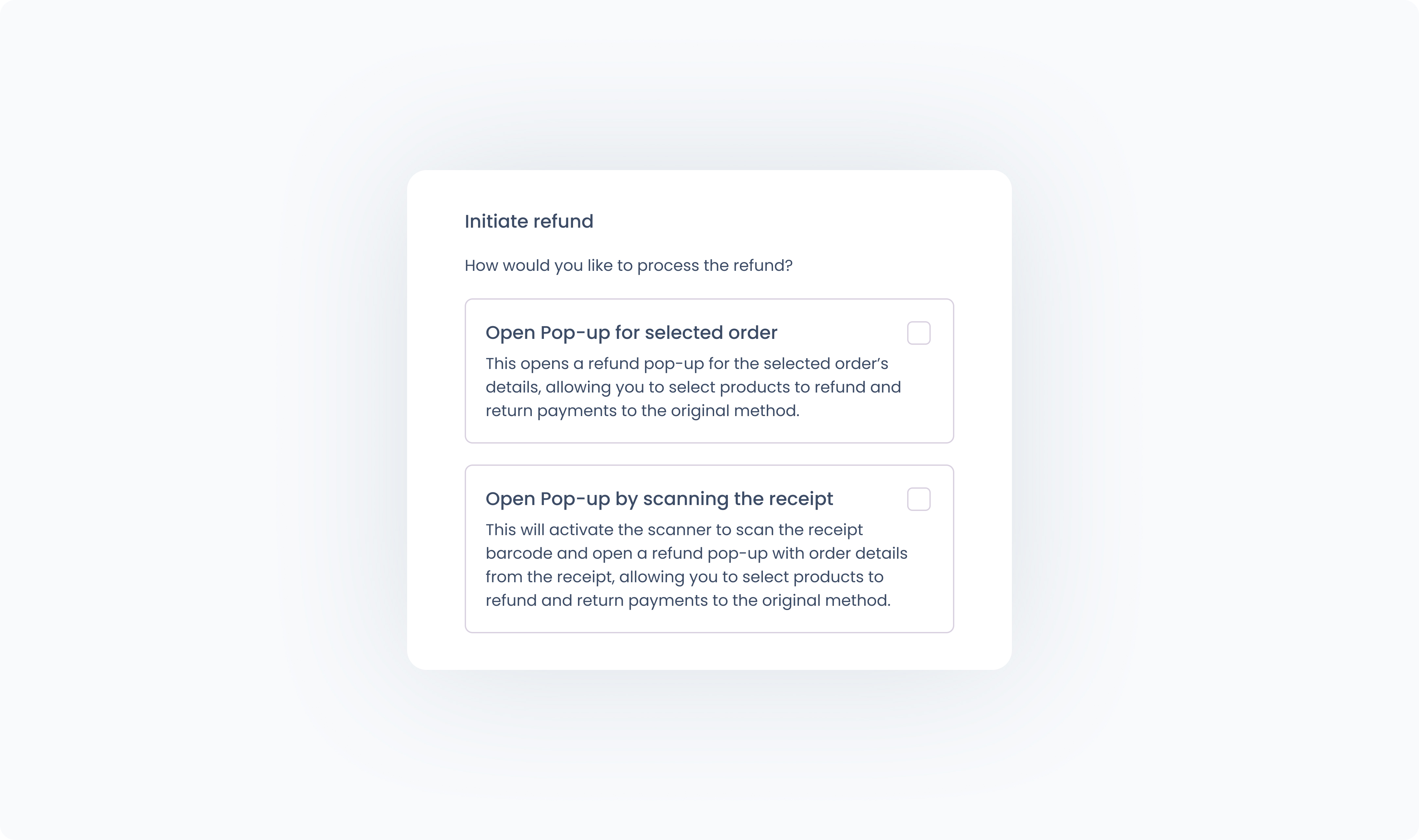 This activates the device's scanner and after that, opens the same refund dialog, prefilled with order data from the scanned receipt. It’s a quick way to process refunds using printed or digital receipt barcodes.