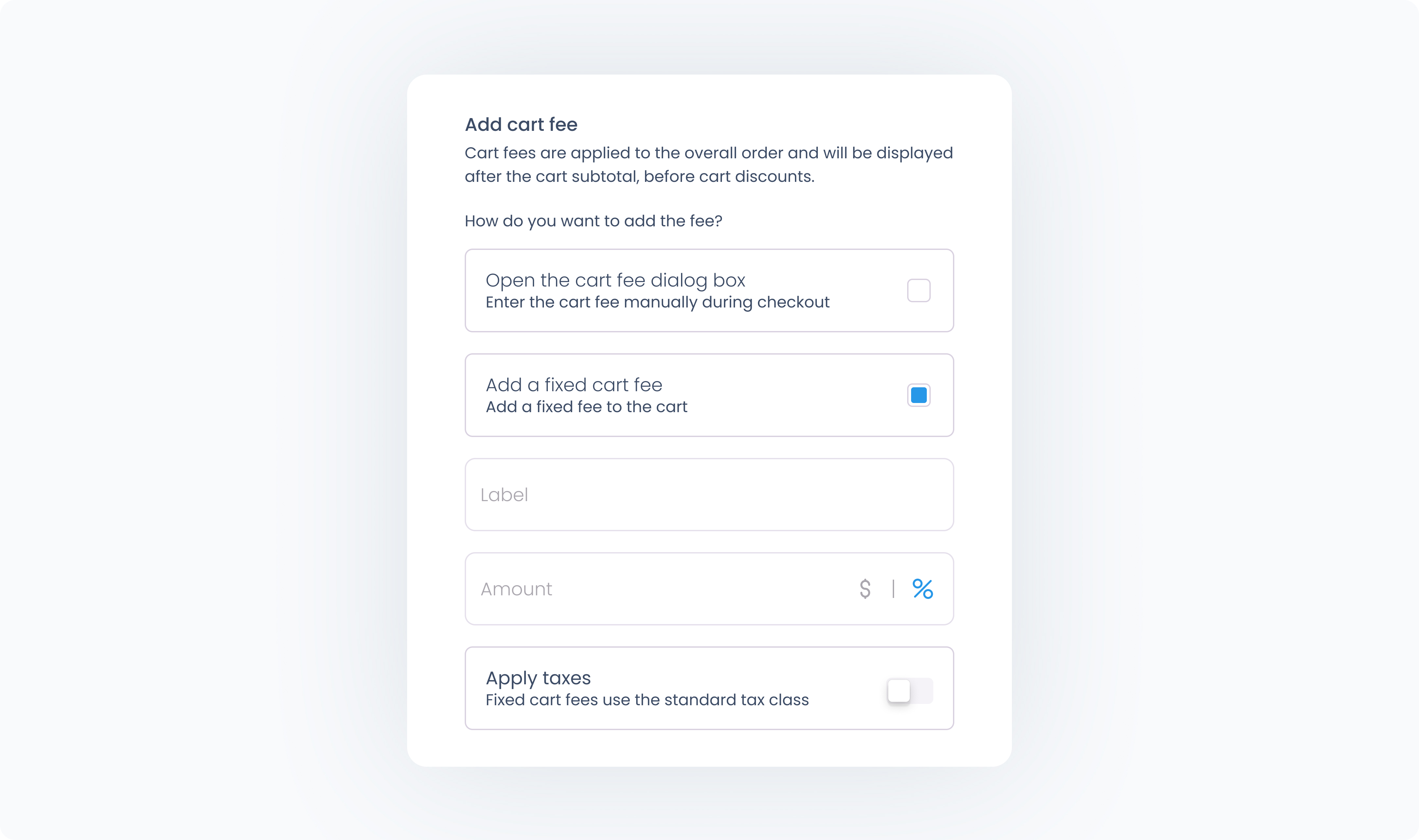 Add fee or discount: Apply a one-time adjustment to the cart total before collecting payment, either as a fixed amount or a percentage