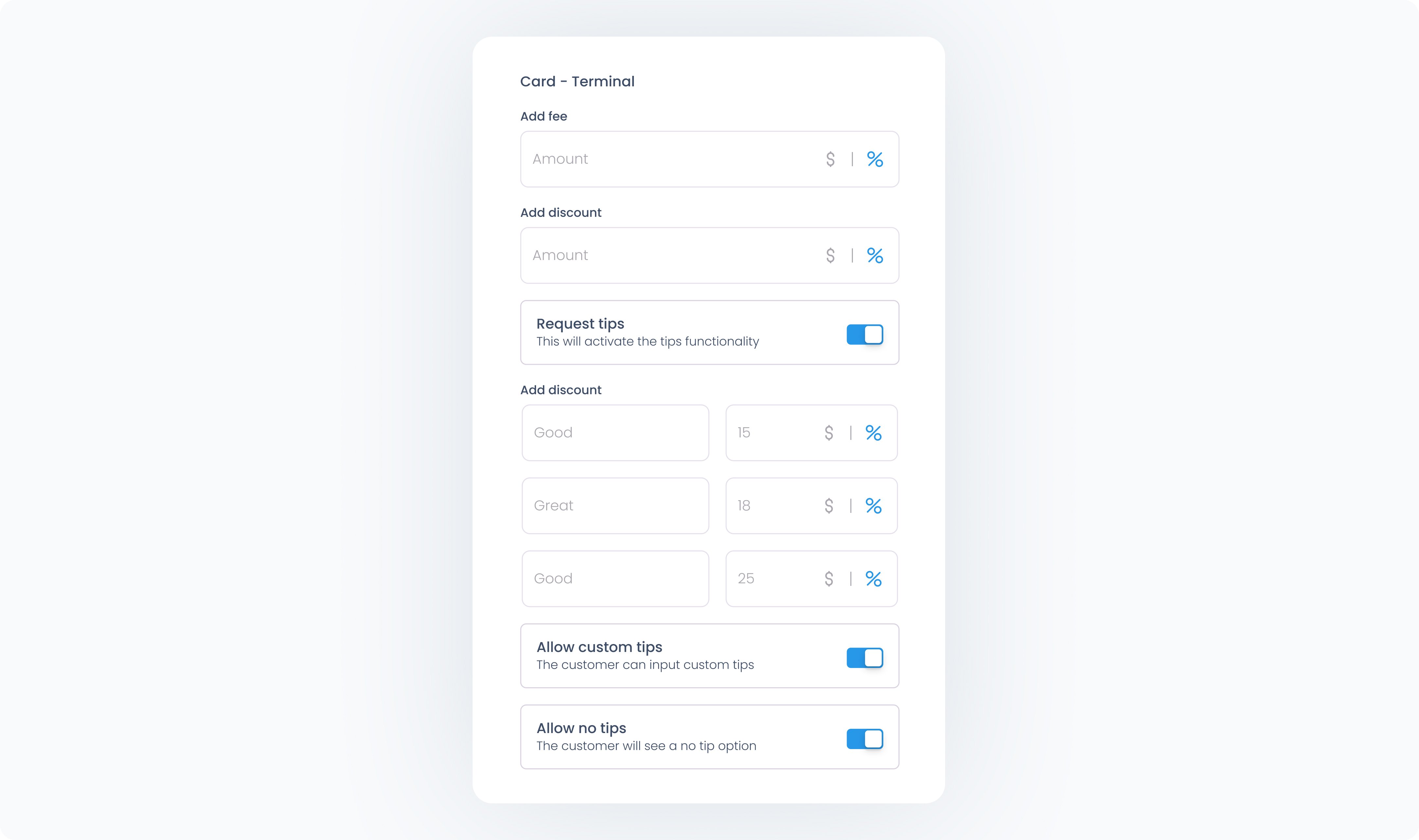 The Card - Terminal action allows the user to collect payment via a physical card terminals, using either a Bluetooth or Cloud connection. This action does not launch a separate dialog box and the payment is triggered immediately, so any amount reductions must be handled beforehand using the Partial payment action.