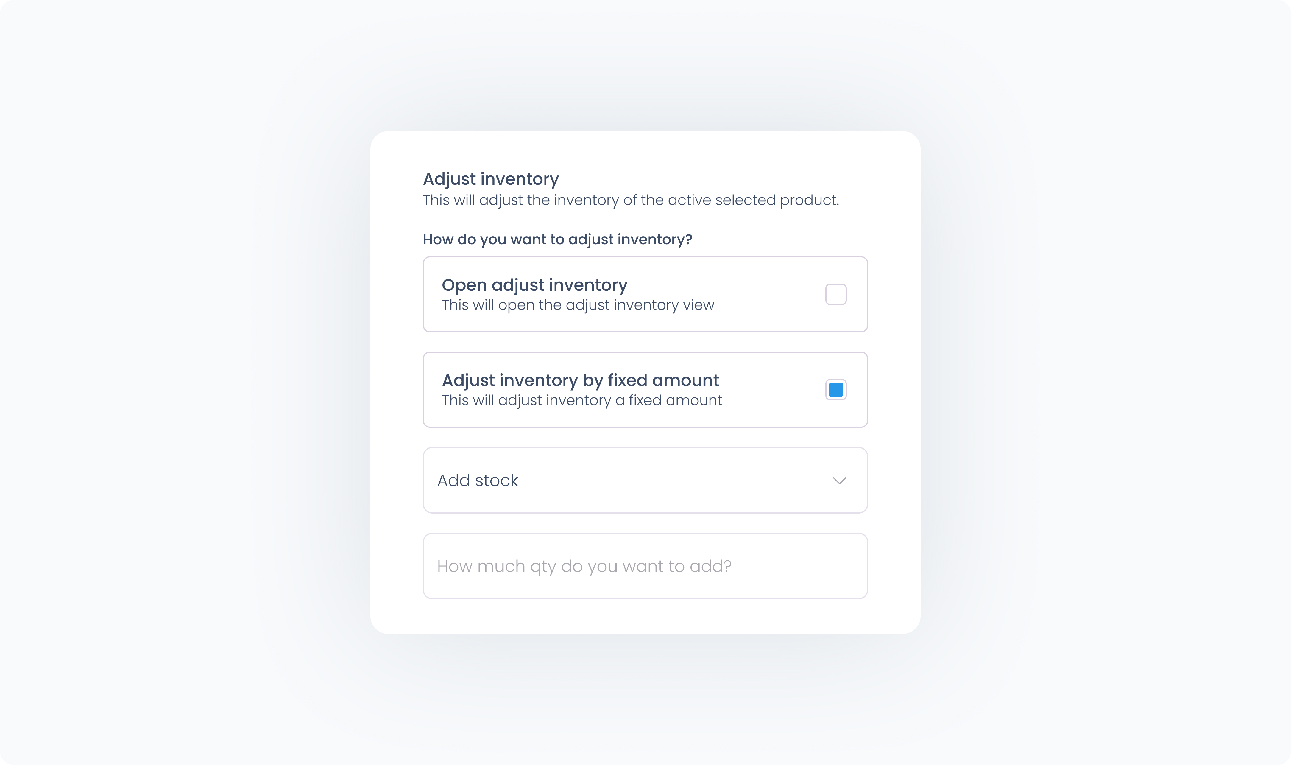 This action updates the stock level of the currently active product. While inventory is automatically adjusted after a sale, this action is useful when additional controls are needed, such as recording restocks, losses, or recounts manually.