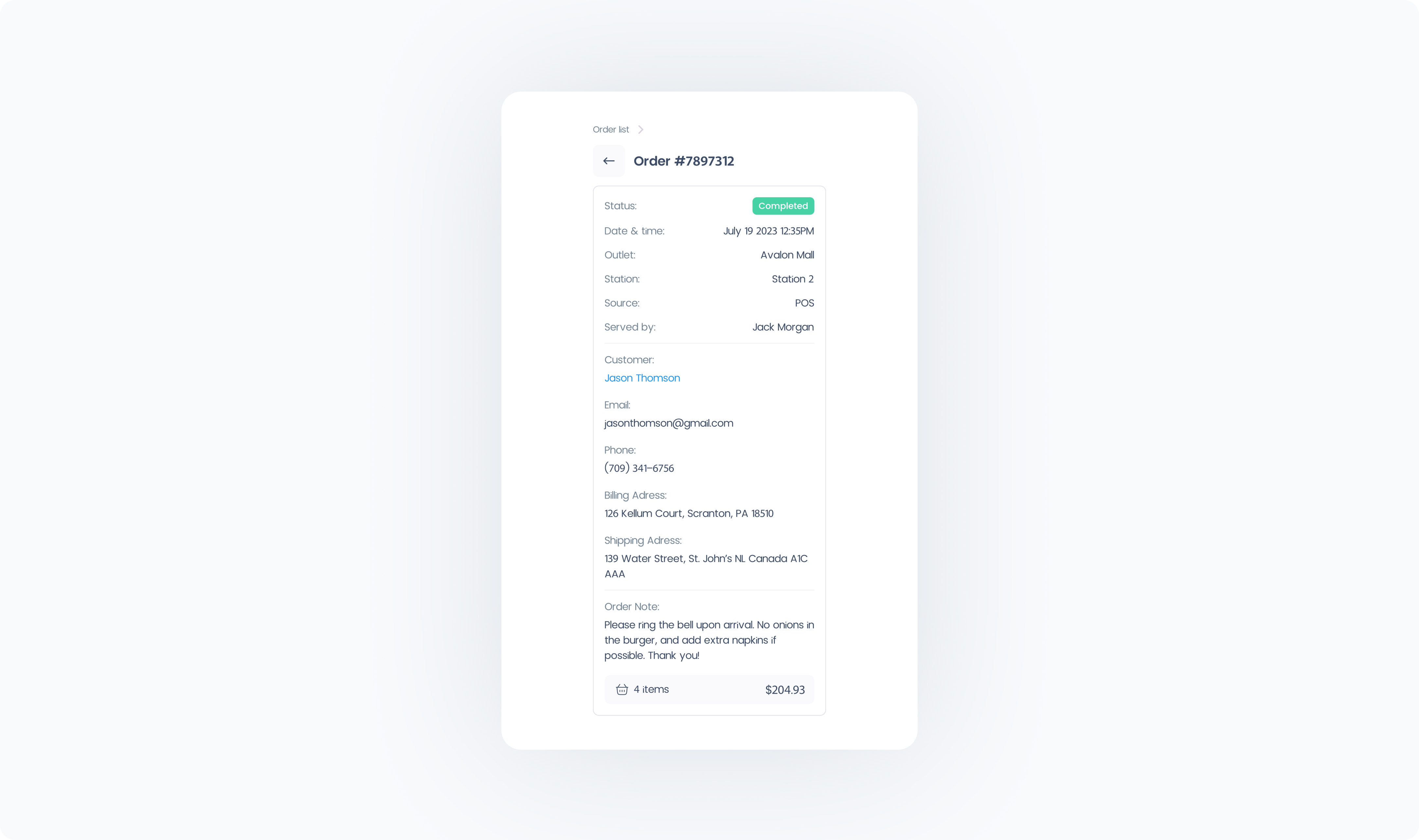 Customer contact & address details – Any phone, email, billing, or shipping address information saved to the order.