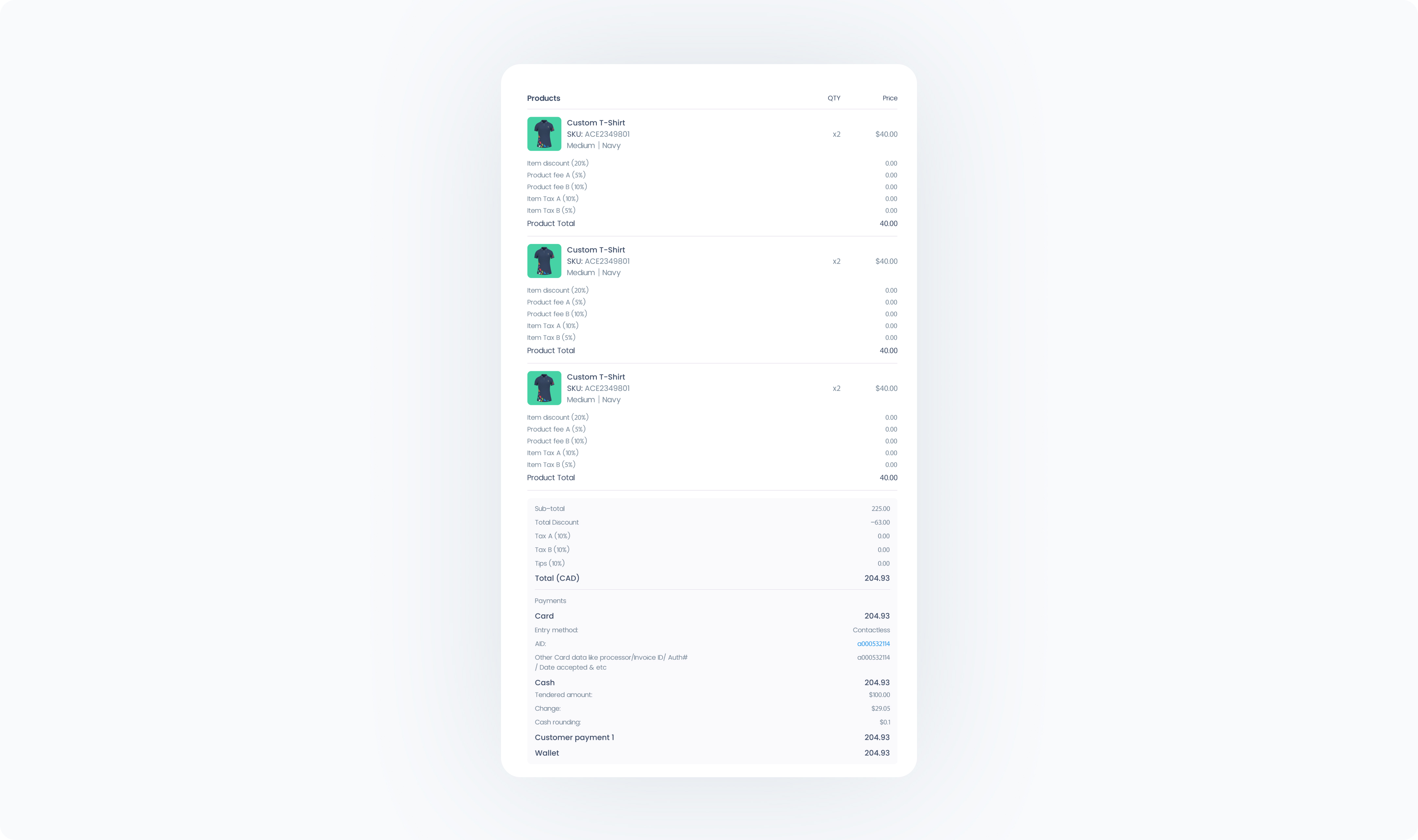 Products – Lists each product in the order, showing name, SKU, quantity sold, and unit price.