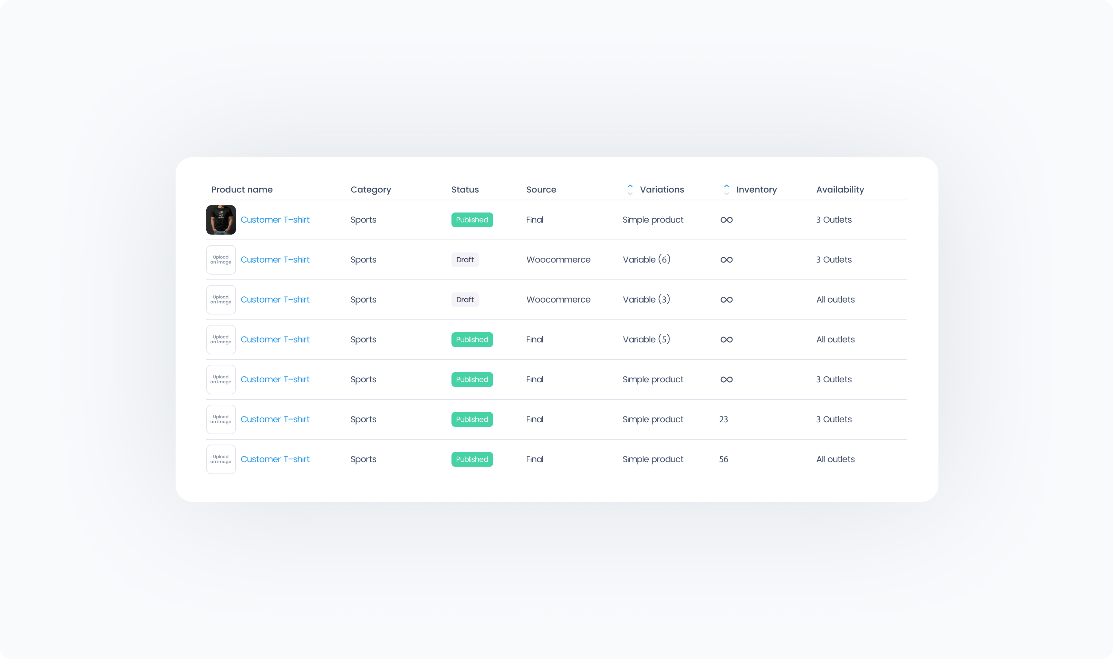 Inventory – Displays current stock quantity, or infinity sign (∞) if stock management is disabled.