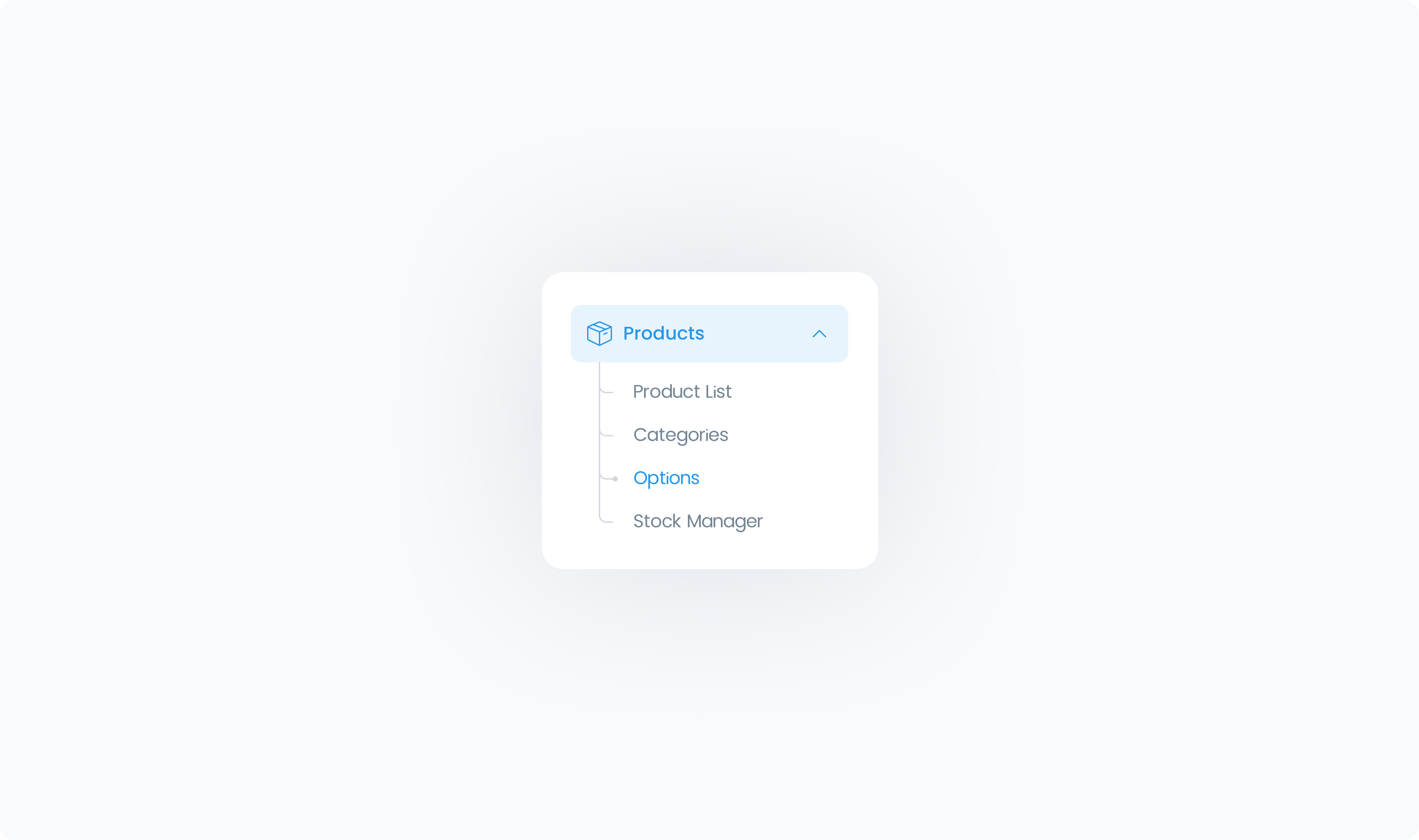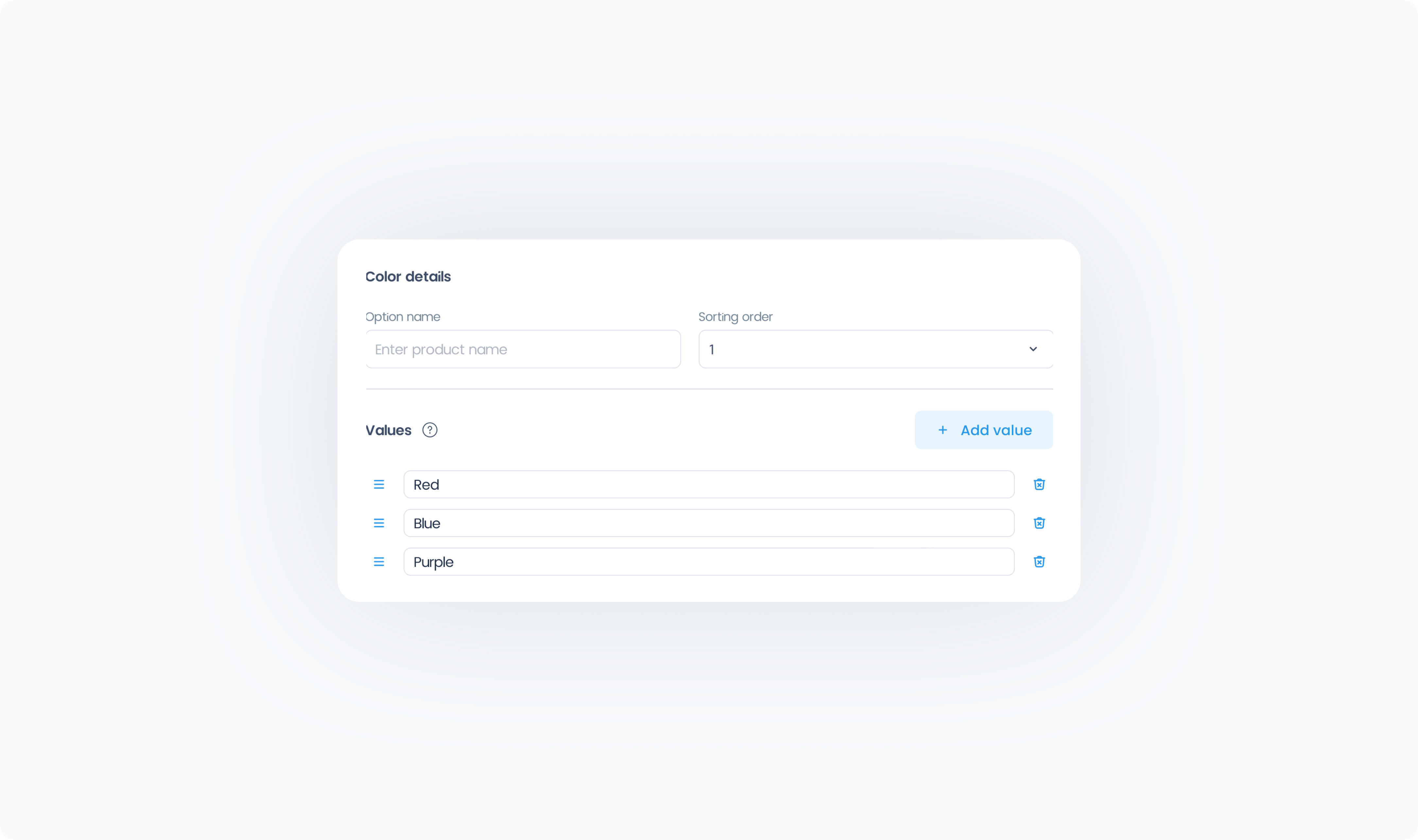 Options are reusable attributes that allow you to create variations of a product, such as different sizes, colors, or materials. Each Option contains a list of option values, such as: