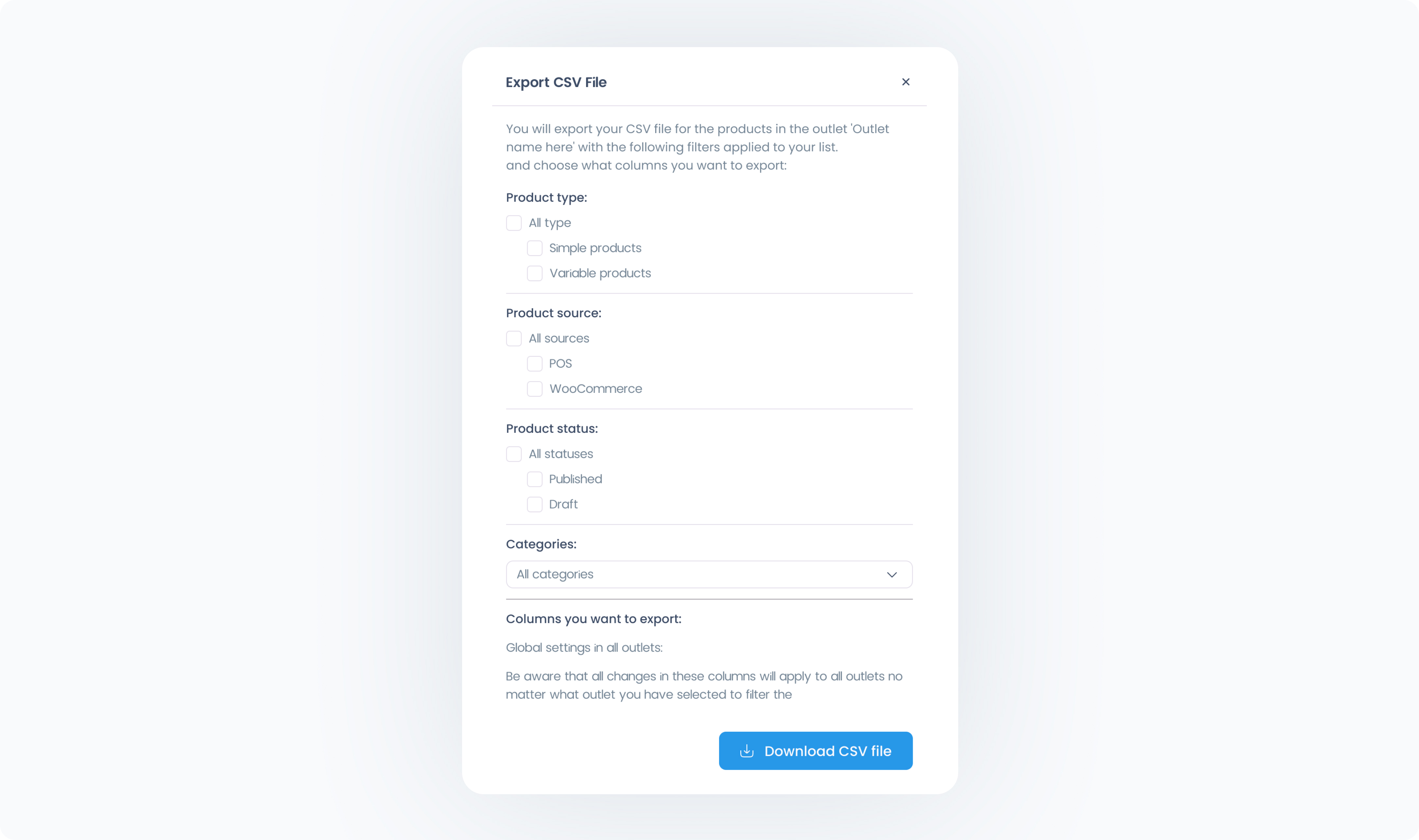 On the Bulk Stock Update page, click Download CSV. This file contains the current stock quantities for all products at the selected Outlet.