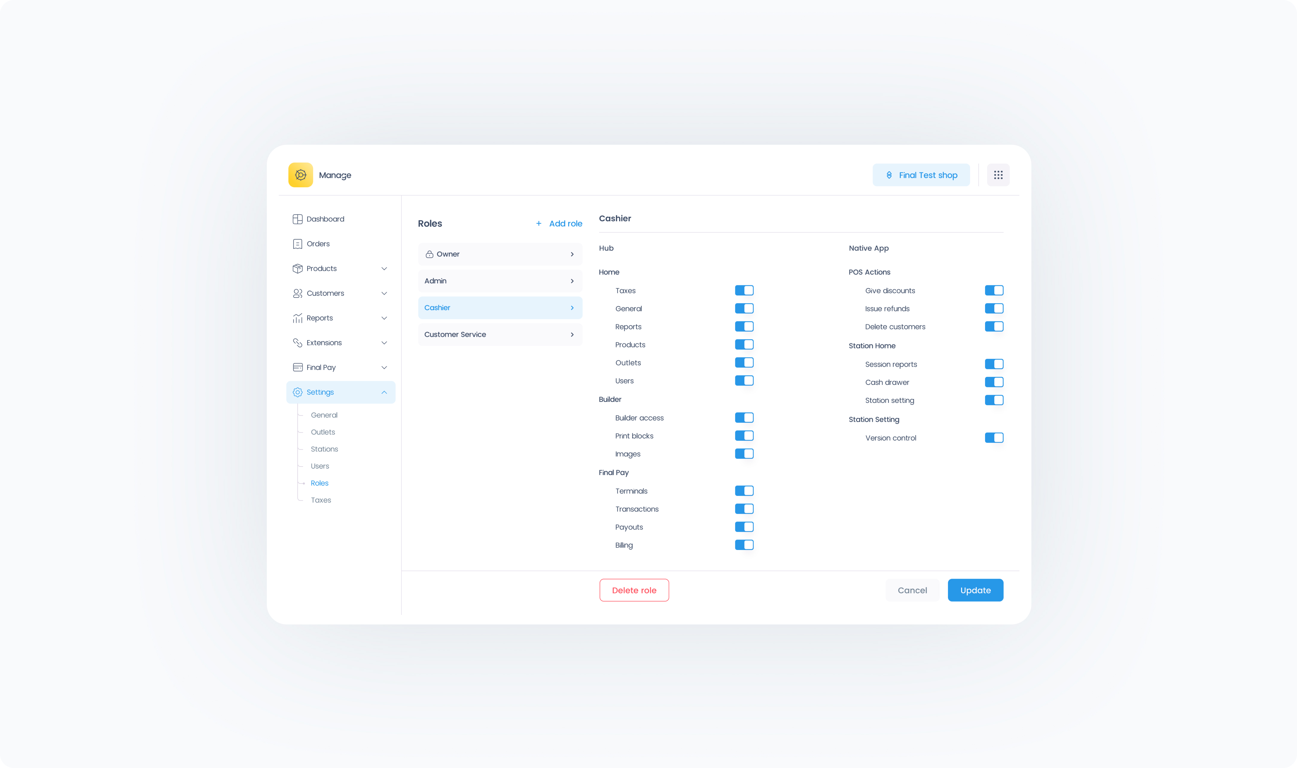 Roles define what a user can see and do across Final’s tools, including Manage, Pay, and the Run Native app. Each Role includes a custom set of permissions that can be toggled on or off to fit the needs of your business, such as whether a user can manage inventory, open the cash drawer, issue refunds, or build flows.